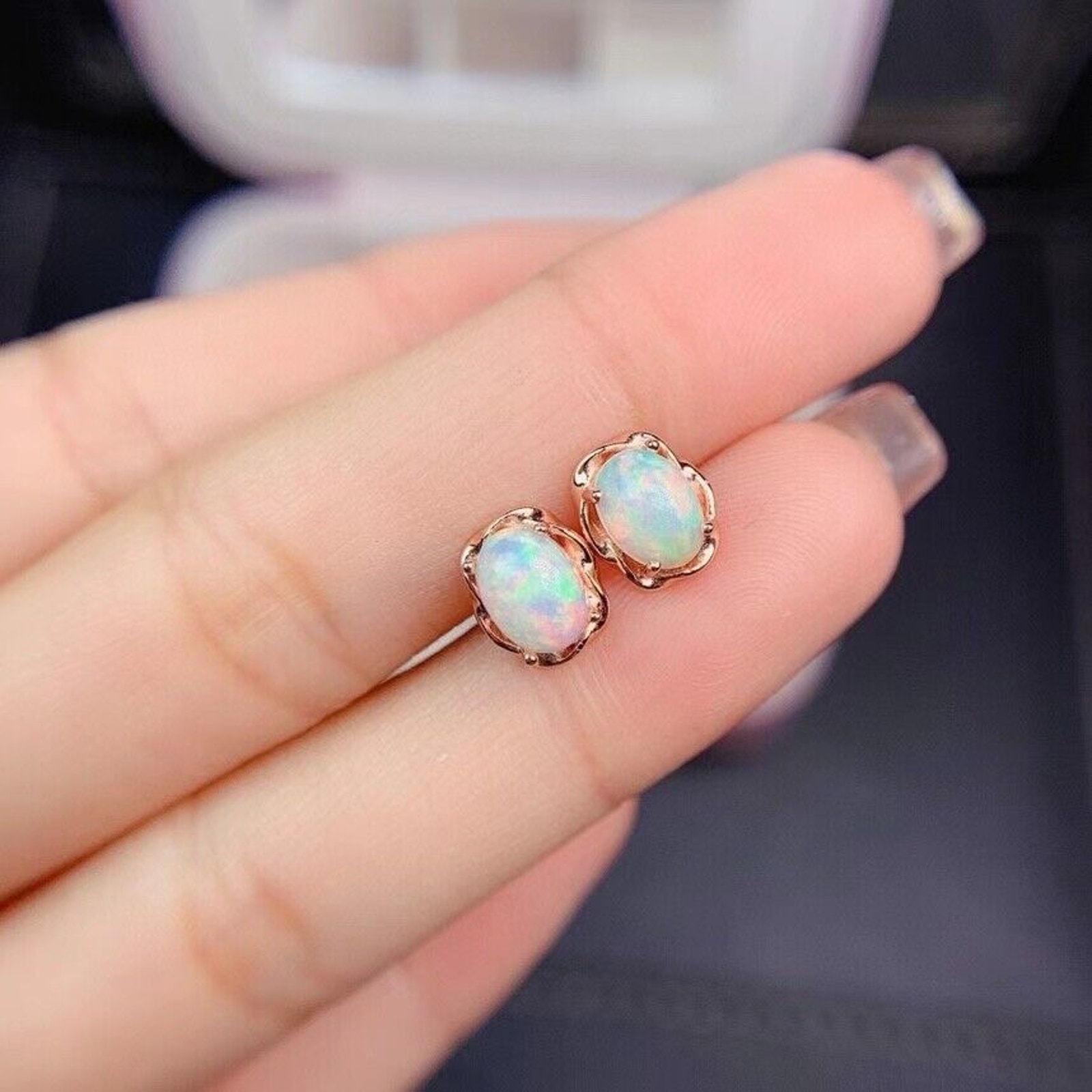 5x7mm Australian Opal Stud Earrings, Natural Opal Stud Earrings Platinum Plated. The main gemstones on these earrings are 5x7mm. These earrings are solid 925 sterling silver, available in platinum plating (silver), or rose gold color. Upon purchasing, please include within your order notes or send a message with your metal color choice (silver or rose gold). This item includes a gift box and a certificate of authenticity with purchase.
