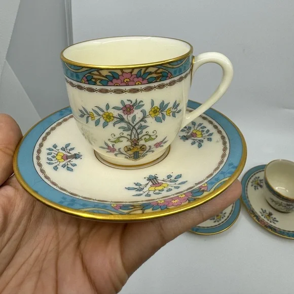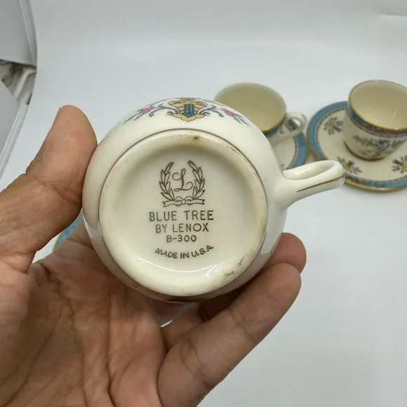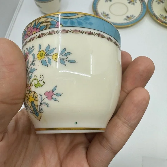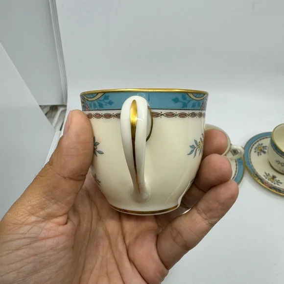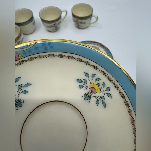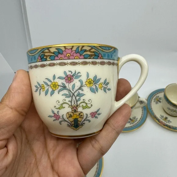 Overall good condition. No chips, cracks or repairs. Do have wear from use and display; some scratching as shown and wear on gold trim. Have been in storage so could use a better cleaning. Includes:4 Saucers-4 3/4” wide4 Cups-2 1/4” tall by 2 1/2” wideThis pattern was discontinued in 1984. These have the gold stamping.