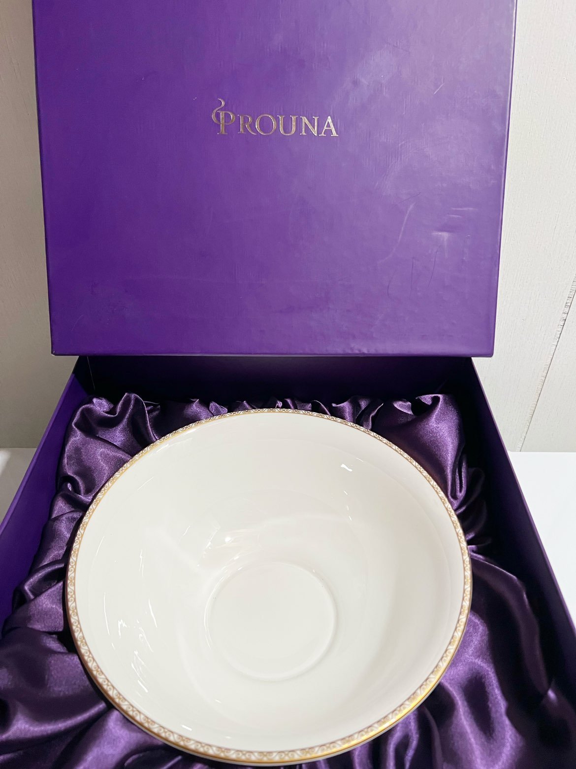 Prouna Fine Bone China specializes in creating tabletop items that combine fine English bone china with Swarovski Elements crystals, for a look that's both festive and refined. Every Prouna item is hand painted with 24kt gold or platinum. Fine Bone China. 24k Gold Plated. Hand Painted. Hand wash recommended. Non-citrus detergent only. Not microwave /oven safe.