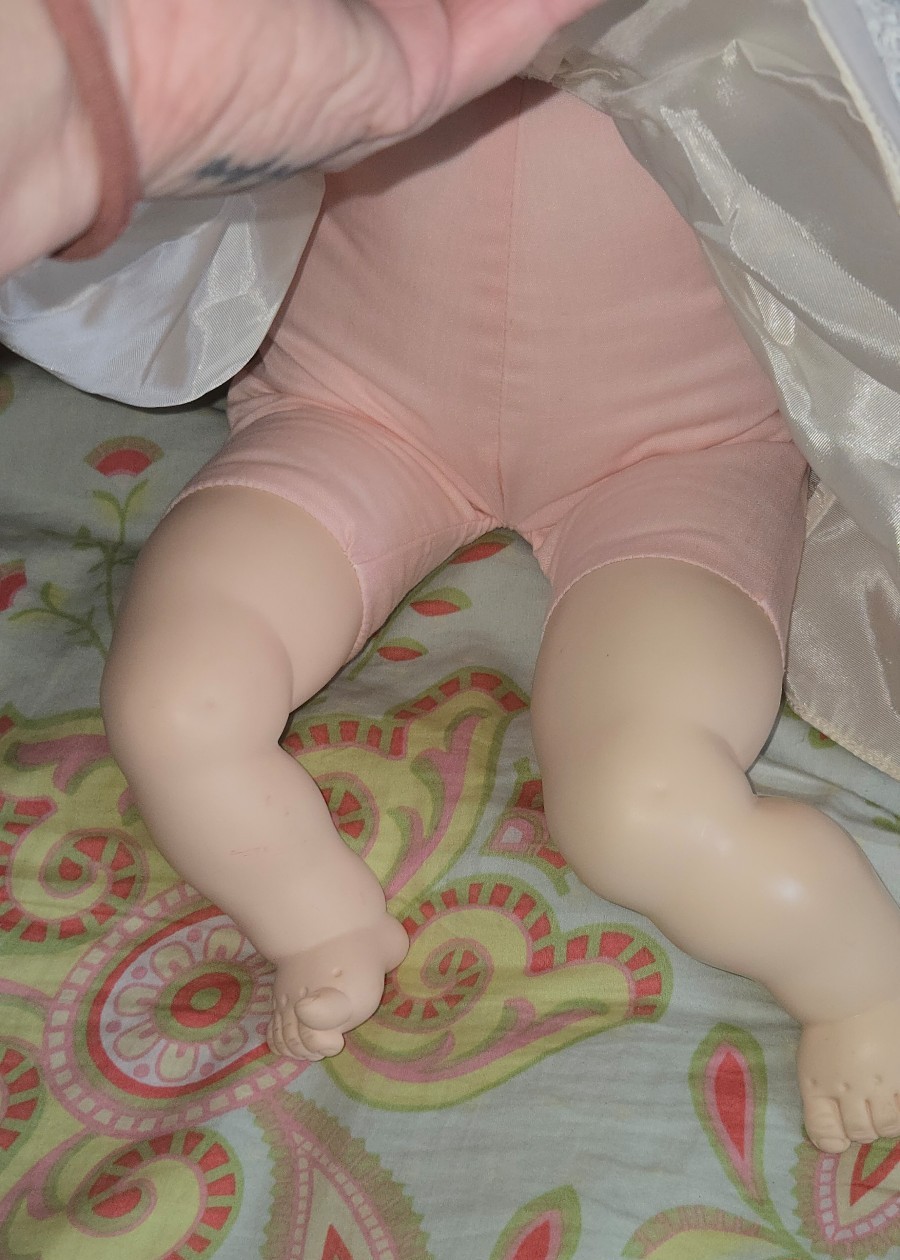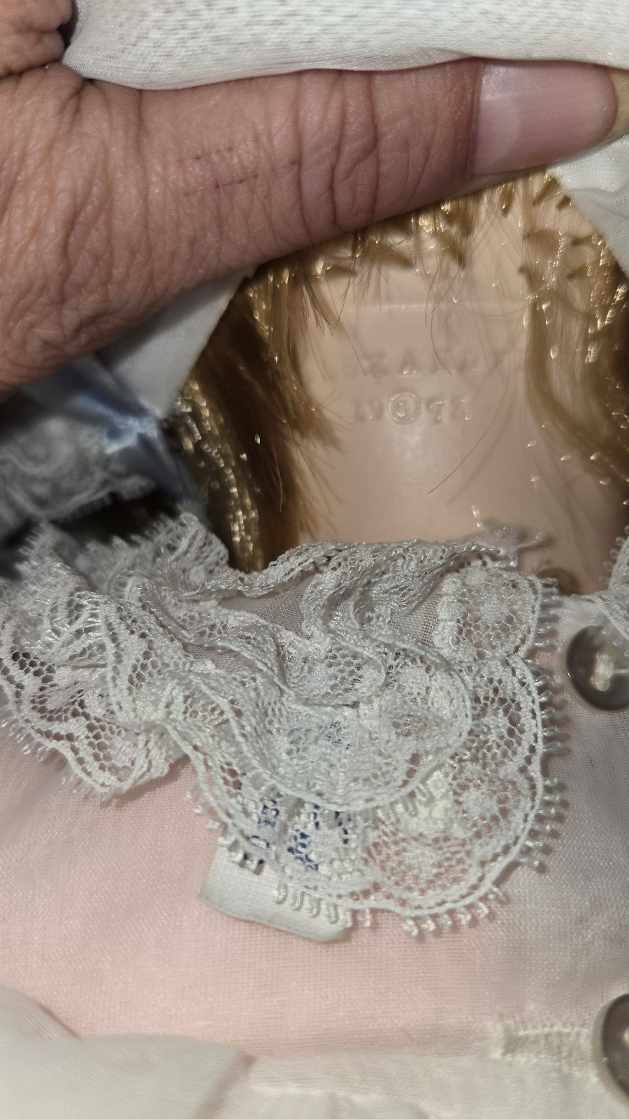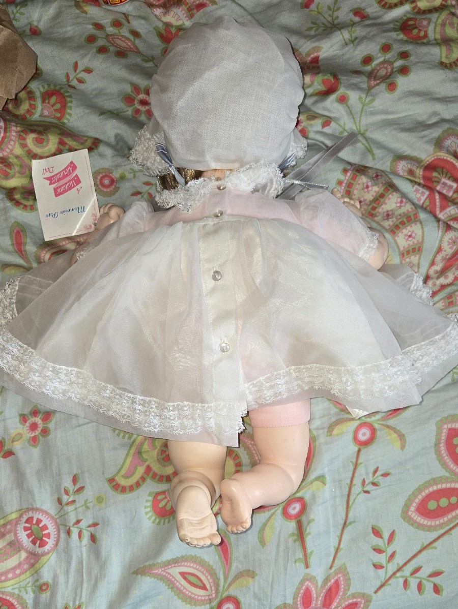 Beautiful vintage doll from 1973. Madame Alexander Mommies Pet. She has strawberry blonde hair, blue sleepy eyes, a working crier when patted. She is approximately 19" long, comes in her original dress & matching bonnet. Her tag is also still attached.